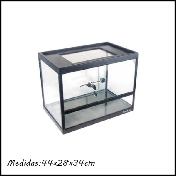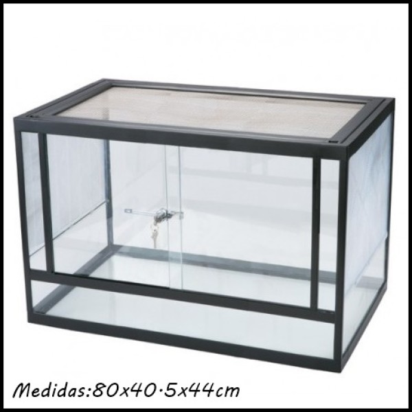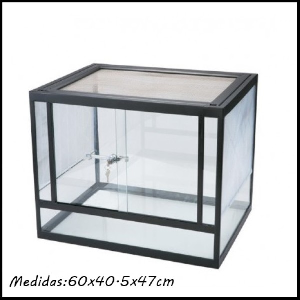 - Terrario de cristal con marco negro con rejilla de ventilación y cerradura de seguridad